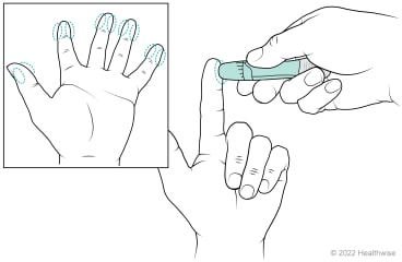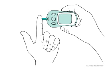 If you have trouble getting a drop of blood large enough to cover the test area of the strip, hang the hand down below the waist. Count to 5. Then squeeze the finger starting close to the hand and moving outward to the end of the finger.