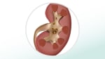 A kidney stone begins as a tiny piece of crystal in the kidney. When the urine leaves the kidney, it may carry the crystal out, or the crystal may stay in the kidney. If the crystal stays in the kidney, over time more small crystals join it and form a larger kidney stone.