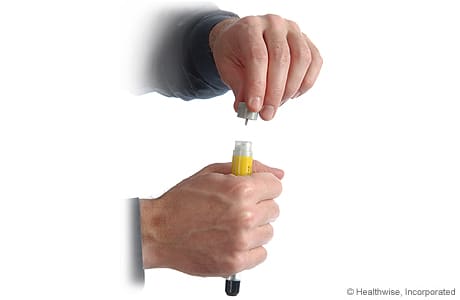 1. Grasp the injector in one fist with the tip pointing down. Follow the instructions for the injector closely. Each one has different steps for use.