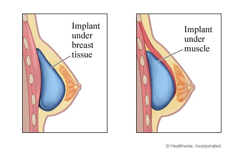 In breast enlargement surgery, the doctor makes the breasts larger by putting an implant under the breast tissue and often under the chest muscle. An implant is a soft silicone shell filled with a saltwater solution or a gel.