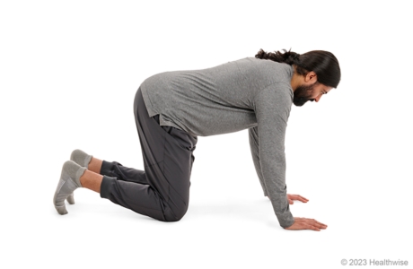 - Start on your hands and knees on a mat or carpet. Place your hands directly below your shoulders and your knees below your hips. Slowly breathe in.