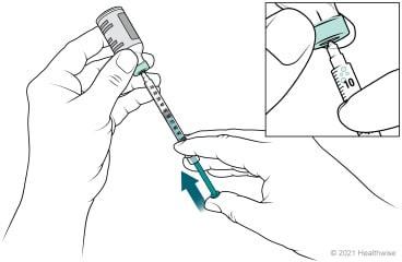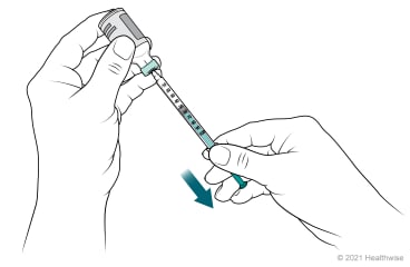 Pull back the plunger to fill the syringe with slightly more than the correct number of units of insulin to be given.