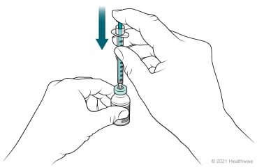 Push the plunger of the syringe to force the air into the bottle. This equalizes the pressure in the bottle when you later remove the dose of insulin.