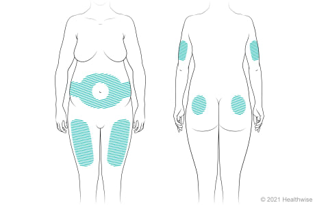 There are several areas of the body where insulin may be injected. You can give yourself a shot in: