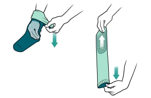 Hold the top of the stocking with one hand. Then with your other hand, reach in and grab the heel.